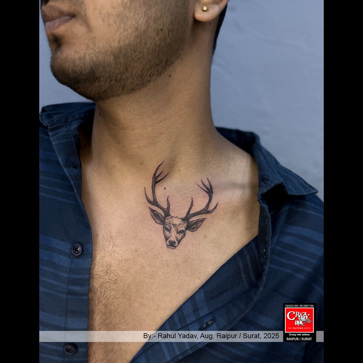 This finely detailed deer head tattoo, crafted by Rahul Yadav at Crazy Ink Tattoo & Piercing Studio (Raipur / Surat), captures the calm and noble spirit of the deer — a symbol of peace, intuition, and spiritual awareness. The clean linework and balanced shading create a lifelike effect, while the positioning near the collarbone adds sophistication and depth to the design.