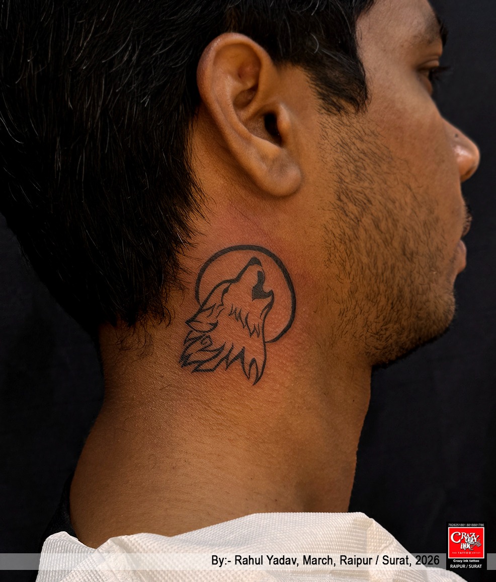 This bold and minimal howling wolf tattoo placed on the neck represents raw power, deep instincts, and the untamed spirit within. The clean linework combined with the circular moon backdrop creates a striking visual balance—symbolizing guidance, intuition, and connection with nature.