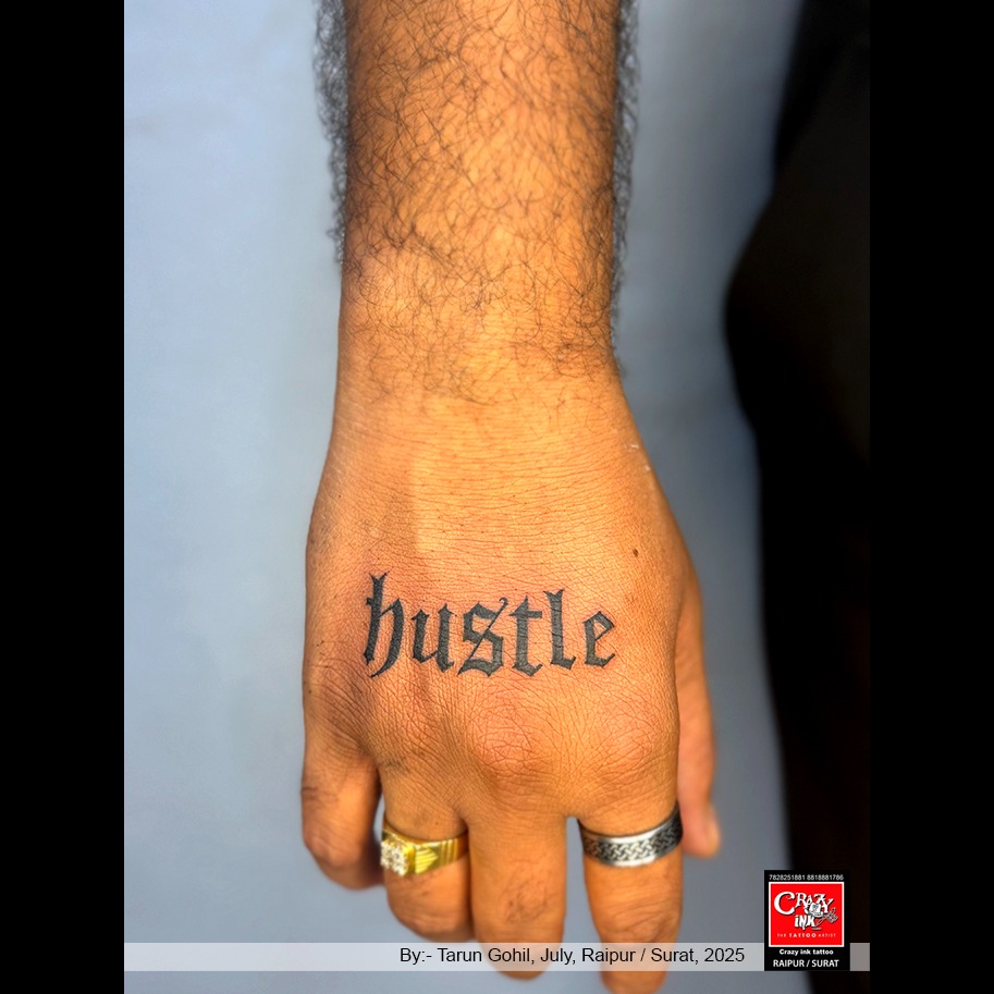 This 'Hustle' tattoo, inked in a striking Gothic font on the hand, represents determination, consistency, and the never-give-up spirit. Every time you look at it, it reminds you that success doesn’t come overnight — it takes hard work, passion, and perseverance. A hand tattoo is one of the most visible placements, making it a statement of lifestyle and mindset.