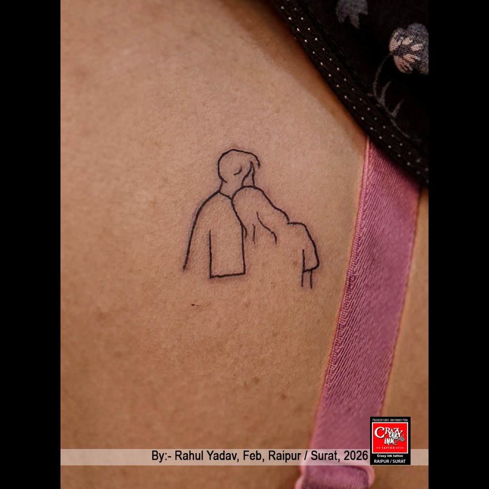 This minimal couple line tattoo beautifully captures the essence of love, comfort, and emotional connection. Designed with soft, continuous lines, the artwork portrays two individuals sharing a quiet, intimate moment β symbolizing trust, warmth, and a deep bond beyond words.