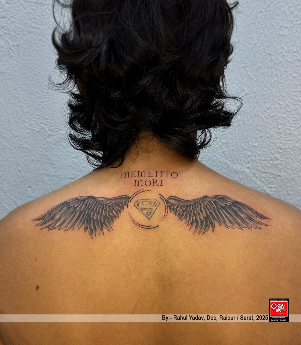 This upper-back tattoo features a powerful “Memento Mori” inscription, a timeless Latin phrase meaning “Remember that you must die.” Far from being dark, this concept represents awareness, humility, and a deep reminder to live every moment with intention and courage.