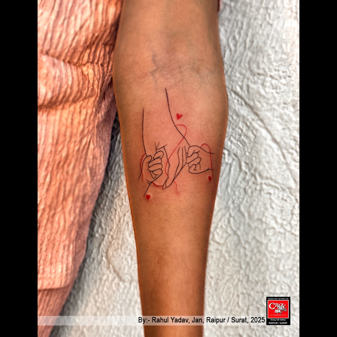 This elegant minimal tattoo captures the timeless beauty of human connection through a delicate line-art design of two hands gently holding each other. The fine black outlines paired with subtle red accents and tiny hearts symbolize love, trust, and emotional bonding.