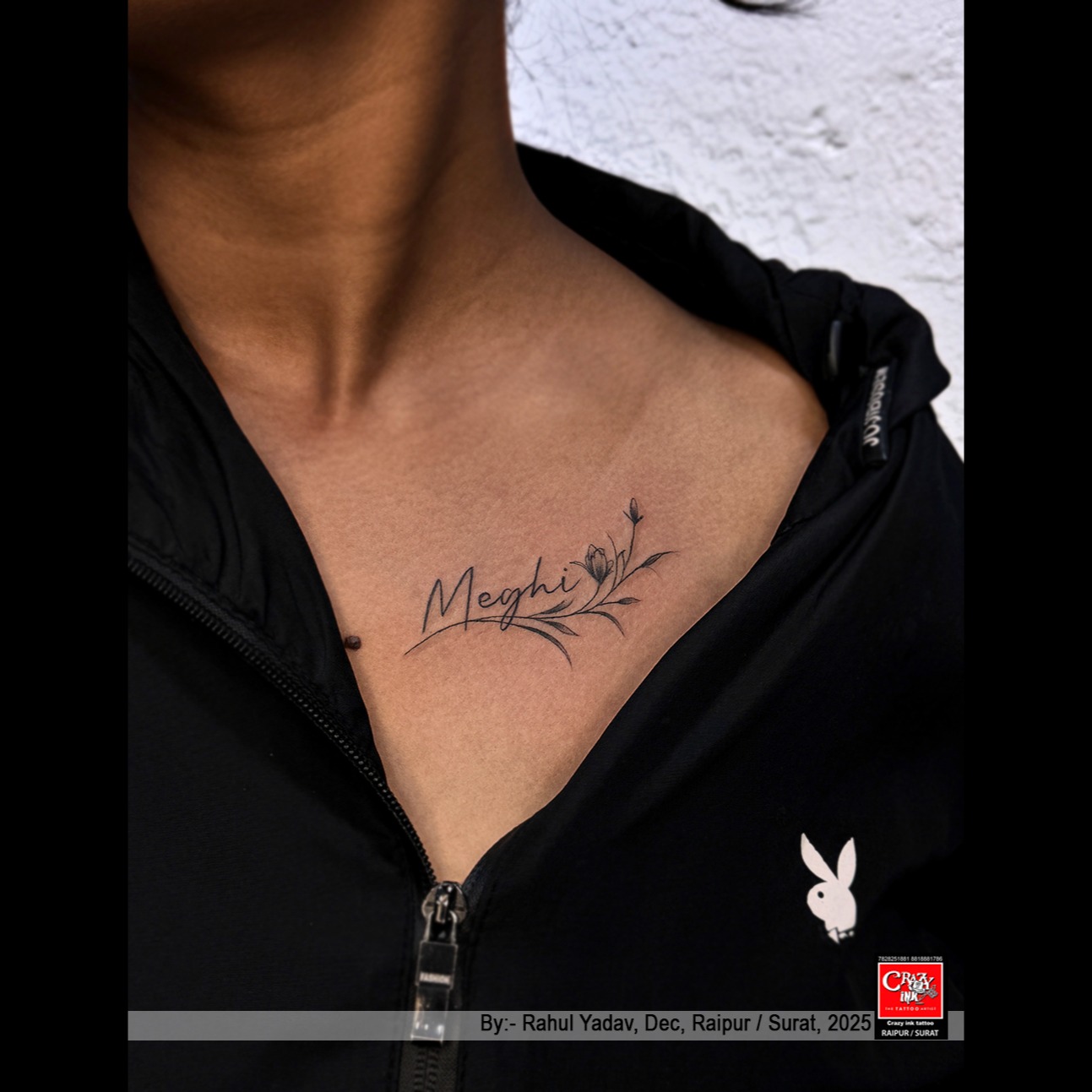 This beautifully crafted collarbone tattoo features a delicate script name “Meghi” seamlessly blended with fine-line floral elements. Designed with precision and softness, the flowing typography adds a personal touch while the subtle botanical detailing enhances femininity and grace.