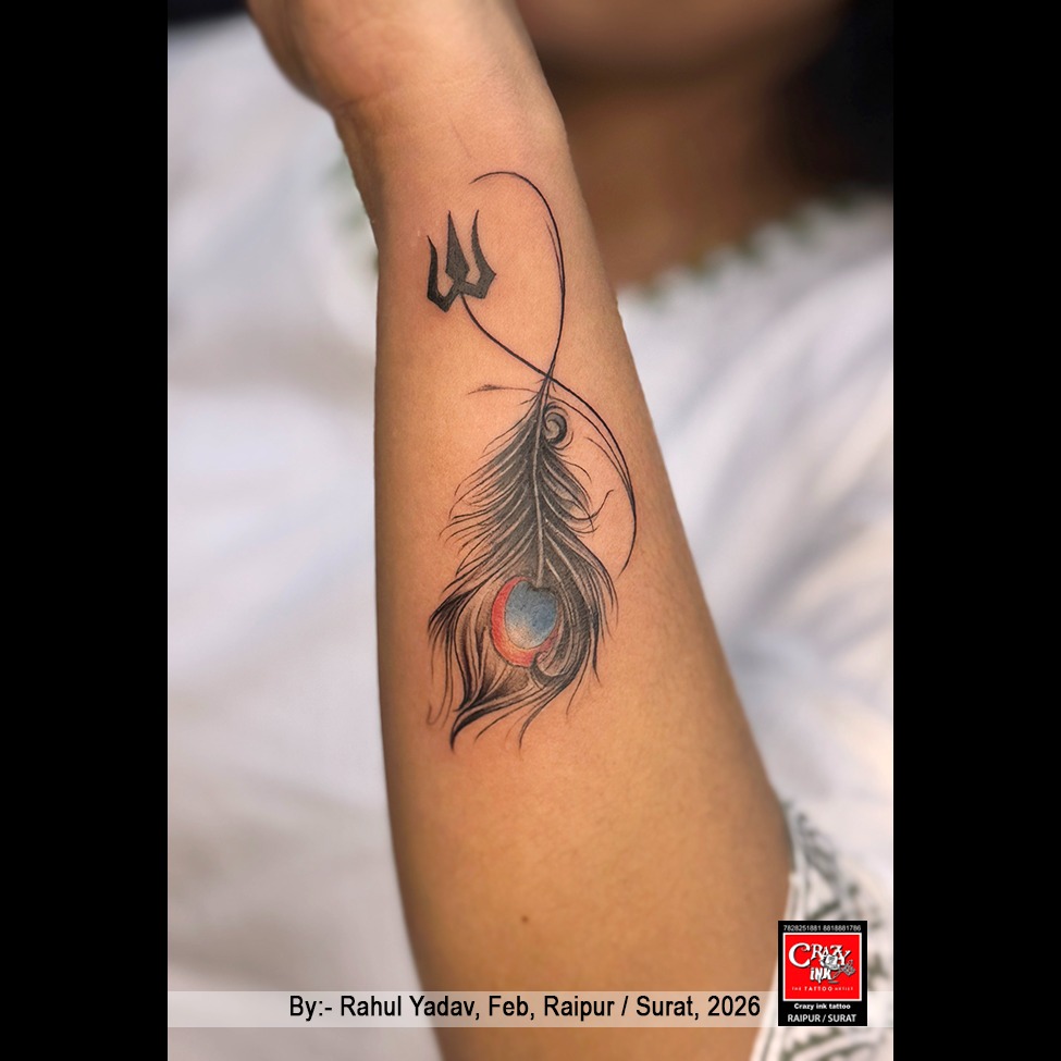 This elegant tattoo beautifully blends the sacred strength of the Trishul with the delicate grace of the peacock feather (Mor Pankh), creating a design that symbolizes both power and serenity. The Trishul, representing Lord Shiva’s energy, stands for destruction of negativity, protection, and spiritual awakening. Flowing seamlessly into a fine-line infinity loop, it reflects eternal balance and the continuous journey of life.